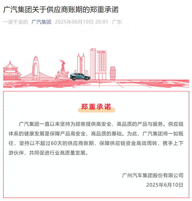 6月10日,广汽集团发布关于供应商账期的郑重承诺称,广汽集团将一如既往,坚持以不超过60天的供应商账期,保障供应链资金高效周转,携手上下游伙伴,共同促进行业高质量发展。(广汽集团微信公号)
